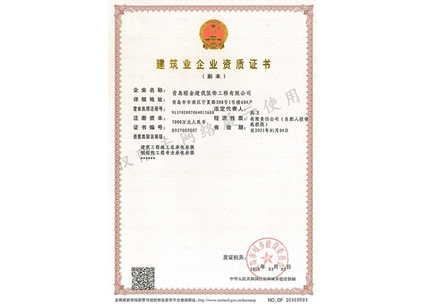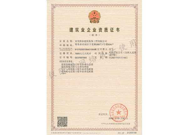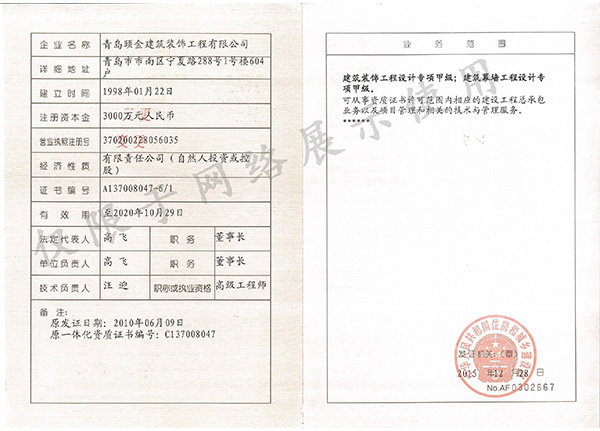建築裝修裝飾工程專業承包壹級 電(diàn)子與智能化工程專業承包貳(èr)級建築幕牆工程專業承包壹級(jí) 消防設施工程專業承包貳(èr)級(jí)建築裝飾工程設計專項甲級(jí) 市政公用工程施工總承包貳(èr)級(jí)建築幕牆工程設計專項甲級 鋼(gāng)結構工程施工總承包貳(èr)級建築工程施工總承包貳(èr)級(jí) 展覽工程施工壹級(jí)建築機電安裝工程專業承包貳級 展覽陳(chén)列工程設計與施工一體化壹級(jí)